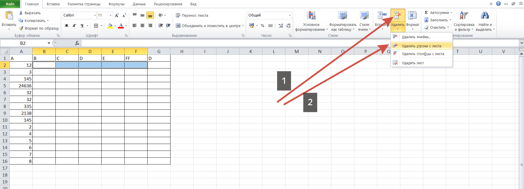 1. Если пустые и лишние строки идут подряд, то их можно выделить мышью и использовать кнопку «Удалить».