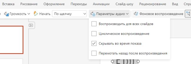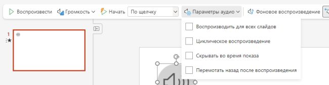 Например, можно воспроизвести его на всех слайдах. Выберите «Параметры аудио» и поставьте галочку напротив пункта «Воспроизводить для всех слайдов».