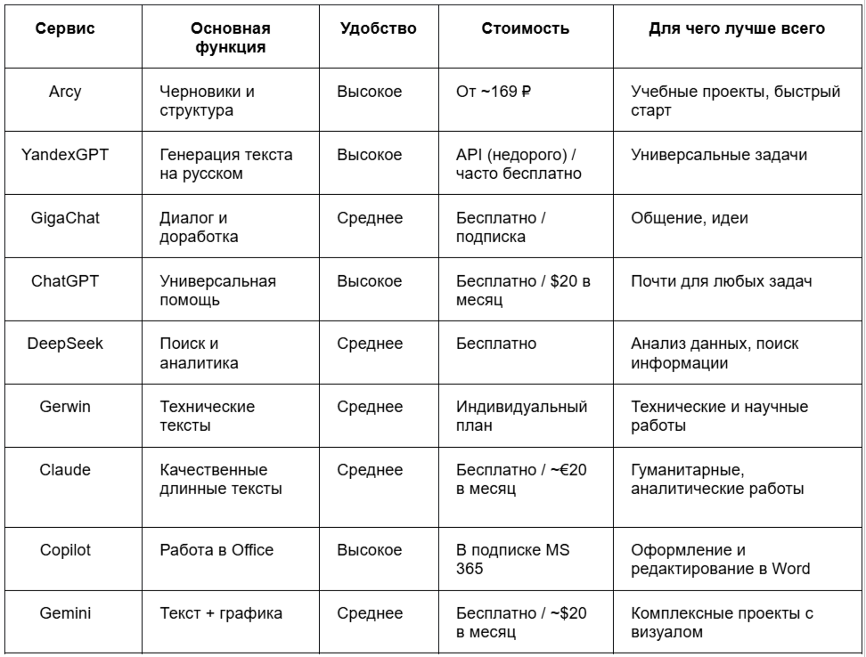 1. Arcy — специализированная нейросеть для учебных работ с автоматическим оформлением по ГОСТу, создает полный текст ВКР за 169 рублей, включает содержание и список литературы. По промокоду I9JRAN306Z скидка 10% на генерацию работы.