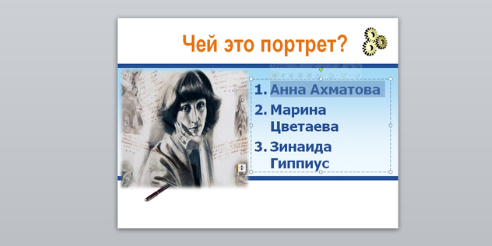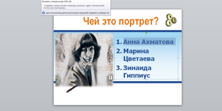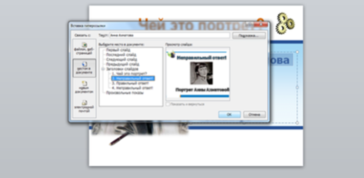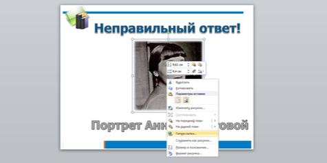 Такая последовательность действий создаст гиперссылку, и при нажатии на изображение Ахматовой, презентация переключится обратно на слайд с вопросом.