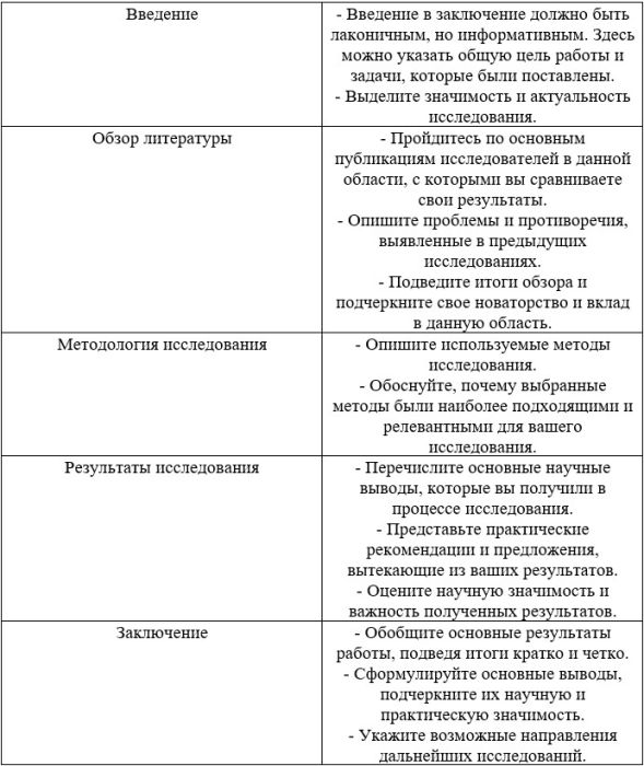 Заключение в диссертации имеет свою структуру и особенности. Оно начинается с общего представления о теме исследования, затем переходит к обзору полученных результатов и наконец формулирует основные выводы и рекомендации.