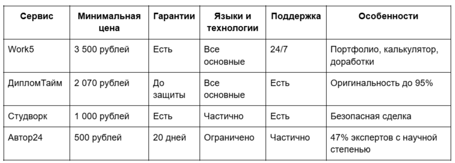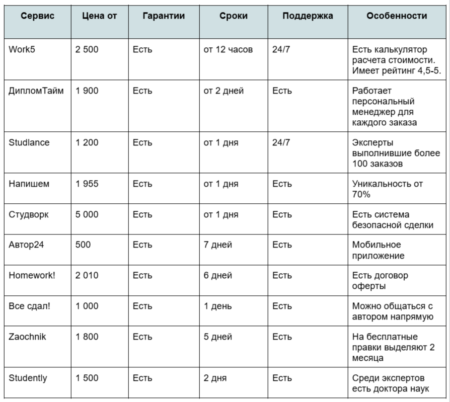 | Сервис | Цена от | Гарантии | Сроки | Поддержка | Особенности |