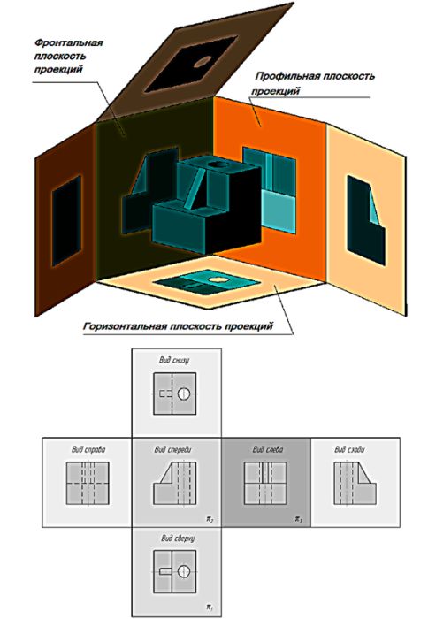 На нижеприведенном рисунке показаны основные проекции, а также приведен пример их применения на чертеже.