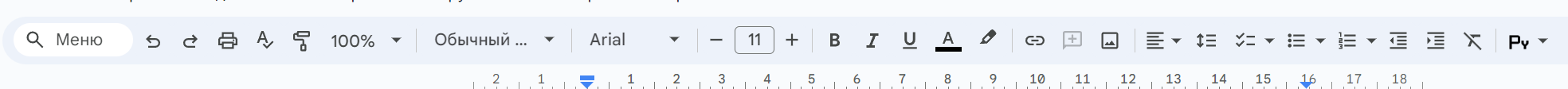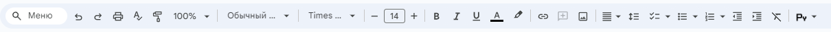 Панель инструментов в Google Документах — это помощник для работы с текстом и его форматирования. Все необходимые функции для редактирования текста, настройки стилей и вставки элементов находятся в верхней части окна документа, что делает их легко доступными во время работы. Давайте рассмотрим элементы панели инструментов и их возможности.